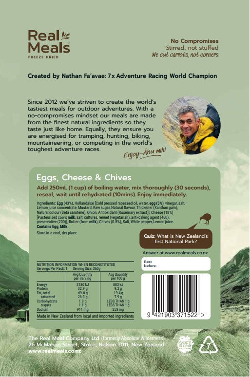 Egg (43%), Hollandaise [Cold pressed rapeseed oil, water, egg (5%), vinegar, salt, Lemon juice concentrate, Mustard, Raw sugar, Natural flavour, Thickener (Xanthan Gum), Natural colour (Beta carotene), Onion, Antioxidant (Rosemary extract)], Cheese (18%) [Pasteurised cow’s milk, salt, cultures, rennet (vegetarian), anti-caking agent (460), preservative (200)], Butter (from milk), Chives (0.5%), Salt, White pepper, Lemon juice.