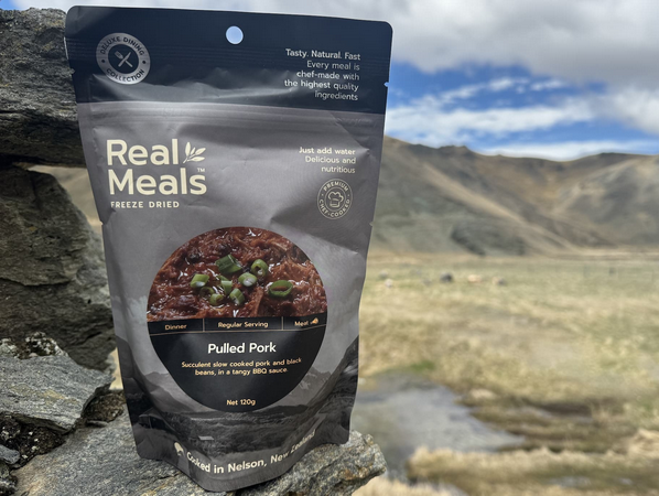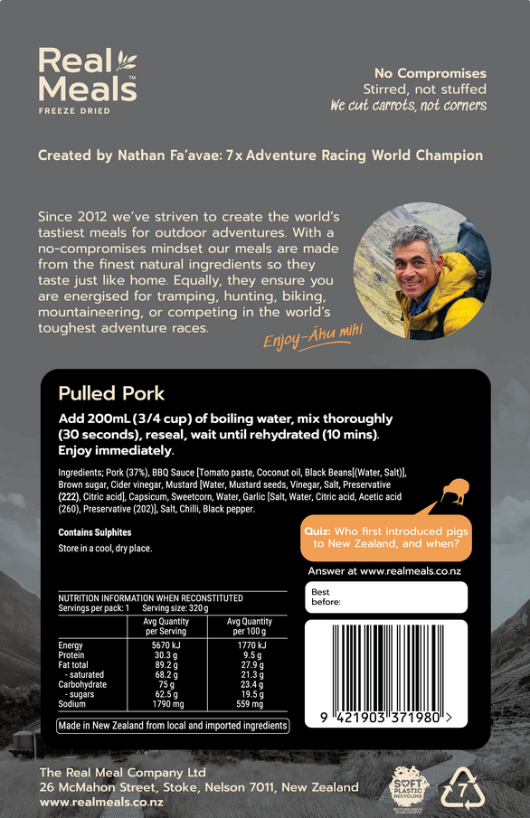 Real Food, Real Adventure Our Pulled Pork with Tangy BBQ Sauce packs slow cooked New Zealand pork, hearty black beans and a tasty, tangy sauce into one bold, homestyle meal. Lightweight, nourishing and bursting with flavour - it's comfort food that fuels your wildest journeys.